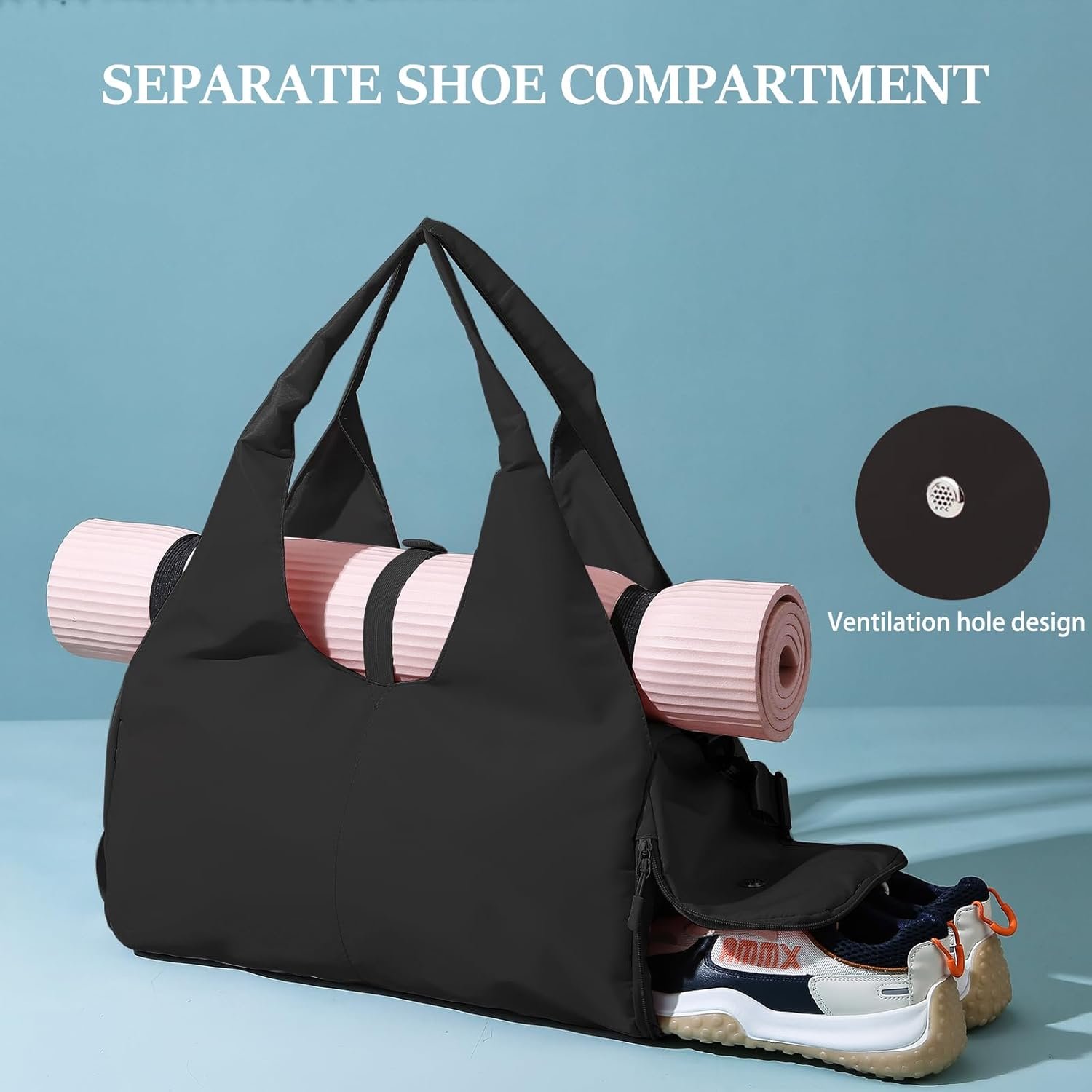 INDEPENDENT SHOE COMPARTMENT: The yoga mat carrier is designed with an independent shoe compartment on the side, the shoe compartment has ventilation holes to create a ventilated environment to keep your shoes dry in the sports bag. Use our yoga gym bag to store your shoes and prevent other items from getting dirty